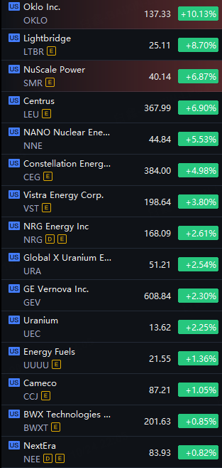 Nuclear Stocks Jump. Oklo up 10%; Lightbridge up 9%; Centrus and Nuscale Power up 7%; NANO Nuclear and CEG up 5%.