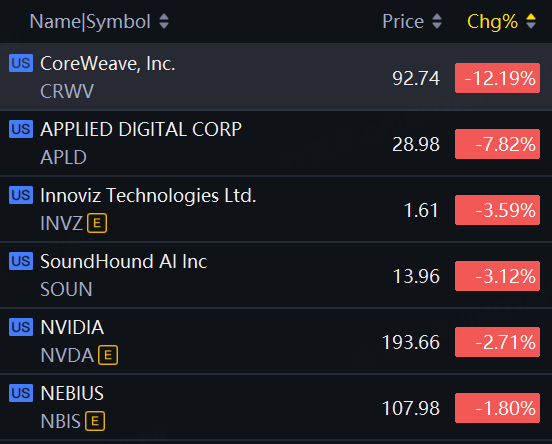 Nvidia-linked shares fell on Tuesday. CoreWeave down over 12%; Applied Digital down 8%; Nvidia, Innoviz, SoundHound AI down around 3%; Nebius down 2%.