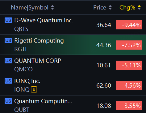Quantum shares slid on Friday. D-Wave Quantum down over 9%; Rigetti down 7%; Quantum Corp down 5%; IONQ down over 4%; Quantum Computing down over 3%.