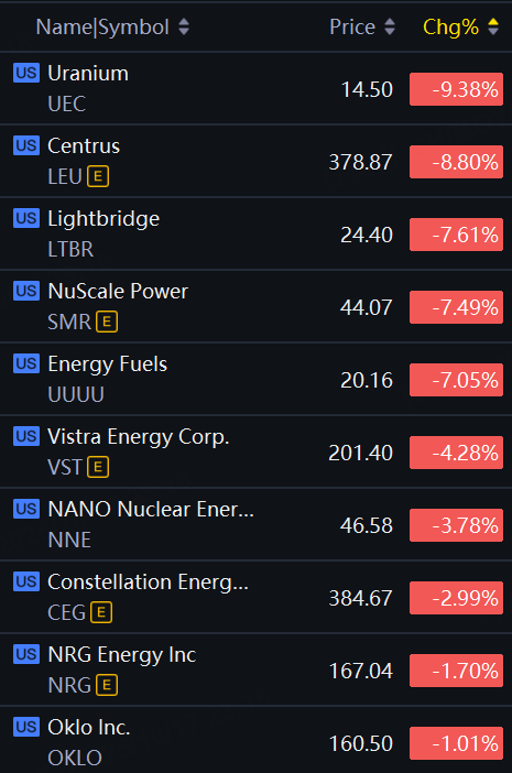 Nuclear stocks fell on Friday. Centrus down 9%; Lightbridge, NuScale Power, Energy Fuels down over 7%; Vistra Energy down 4%.