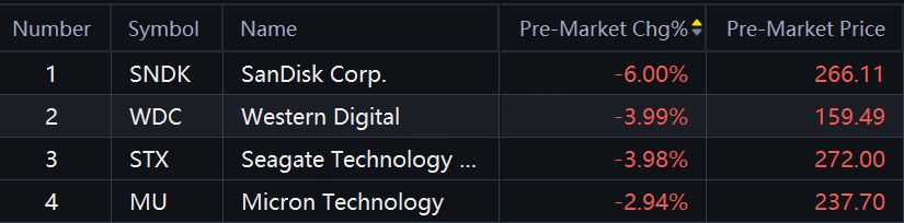 Storage shares pulled back in premarket trading. SanDisk down 6%; Western Digital, Seagate down 4%; Micron down 3%.