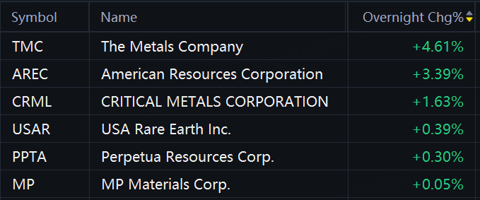 Some Rare earth stocks rose again in overnight trading. The Metals Company rose 5%; American Resources rose 3%; Critical Metals rose 2%.