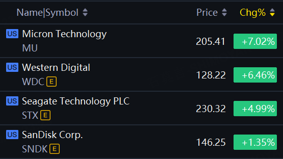 Chip storage stocks jumped on Thursday. Micron up 7%; Western Digital up over 6%; Seagate Technology up 5%; SanDisk up over 1%.