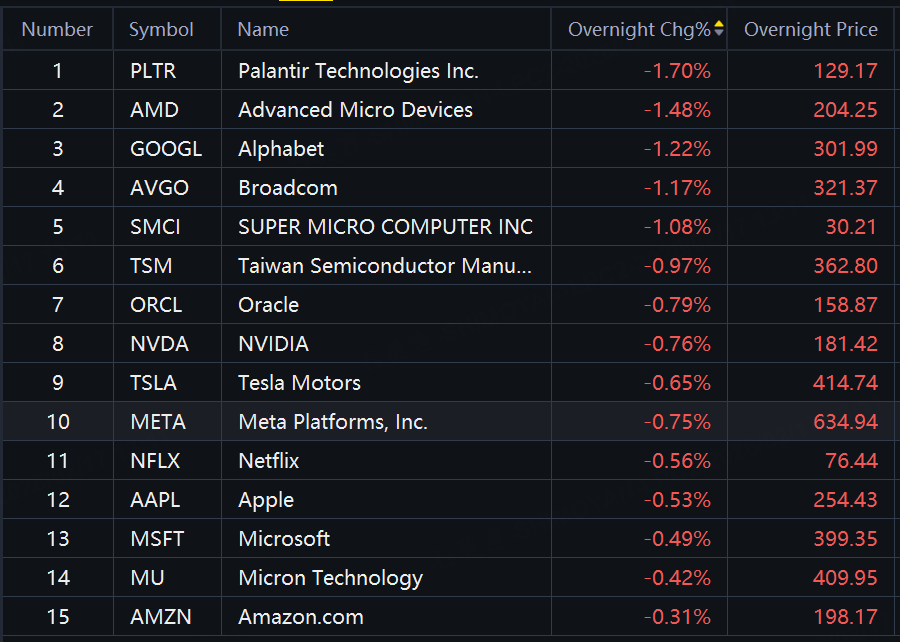 Big tech stocks fell in overnight trading. Palantir, AMD, Alphabet, Broadcom down over 1%.