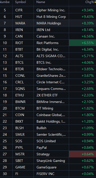 Crypto Shares Jumped; CIFR and HUT up 9%; MARA and IREN up 8%; Canaan, Riot and Bit Digital up 6%; Circle up 3%; BitMine up 2%.
