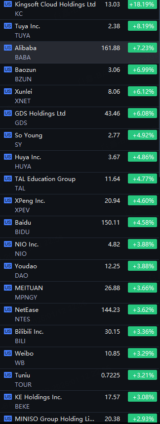 Chinese ETFs and ADRs Jump. Kingsoft Cloud up 18%; Alibaba up 7%; GDS up 6%; CWEB up 5%; Baidu, Xpeng, Nio and YINN up 4%.