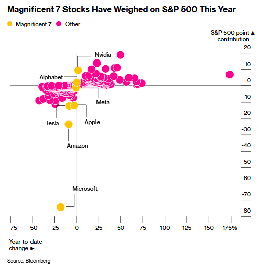 Nvidia isn’t alone in this predicament. The Magnificent Seven tech giants, which have been the largest contributors to stock market gains over the past few years, have been treading water for months. A Bloomberg index of the group has lost nearly 1% since the start of the fourth quarter, underperforming the S&P 500 in that timeframe.