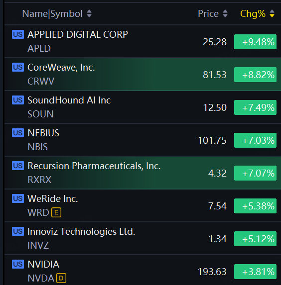 Nvidia-linked shares rose on Thursday. Nvidia soared 4%; Applied Digital, CoreWeave up about 9%; SOUN, Recursion Pharma, Nebius up 7%; WeRide up over 5%.