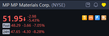 U.S. rare earths company MP Materials Corp. fell 8% in overnight trading after the company said on Thursday its third-quarter loss widened as it stopped sales to Chinese customers as part of an agreement with the U.S. government, although the results surpassed Wall Street expectations.