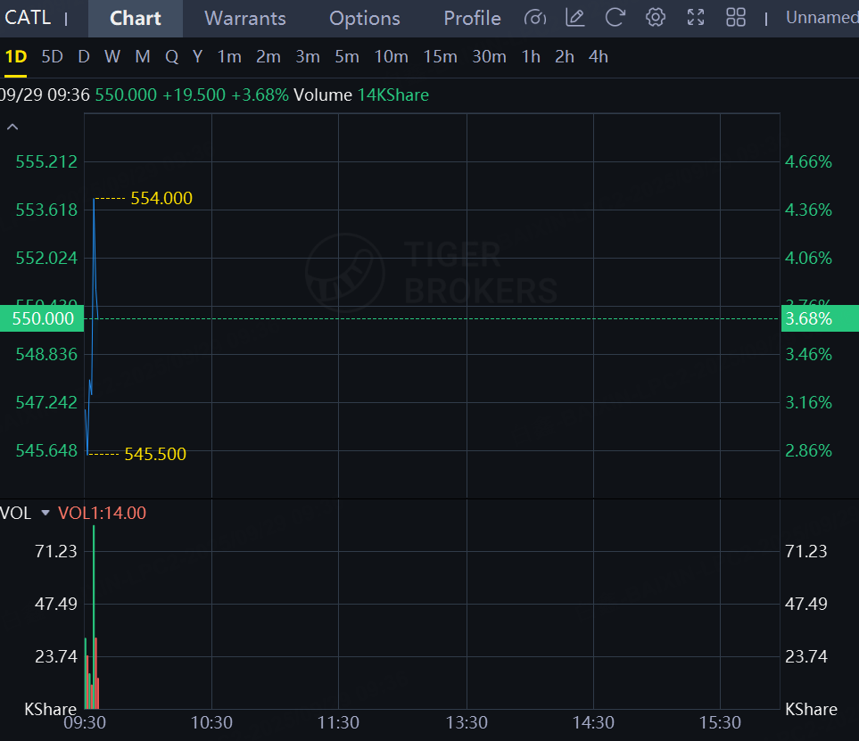 CATL's Hong Kong shares surged over 4% at the opening, reaching HKD 554, marking a new all-time high.