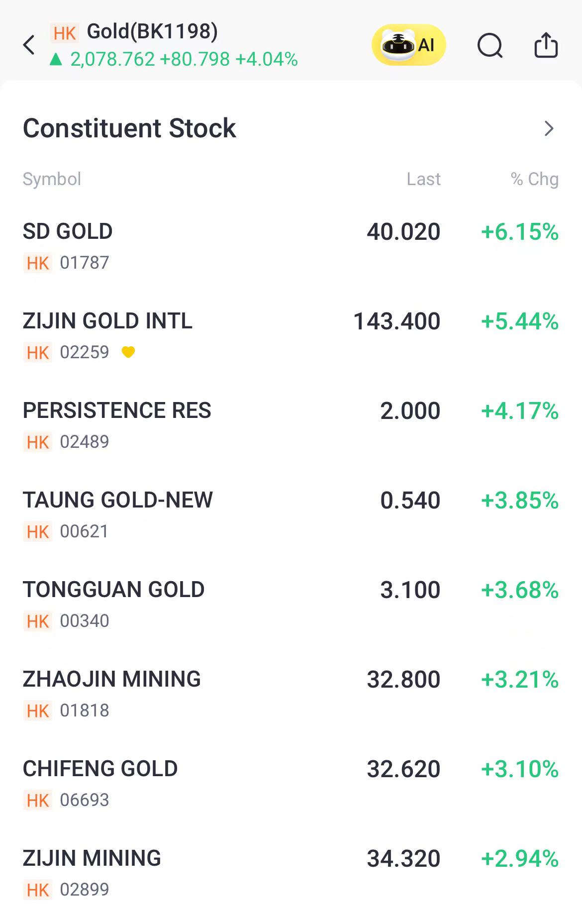 HK Movers | Gold Stocks Shine. SD Gold up 6%; Zijin Gold up over 5%; Persistence Res, Taung Gold up around 4%; Tongguan Gold, Zhaojin Mining, Chifeng Gold up over 3%