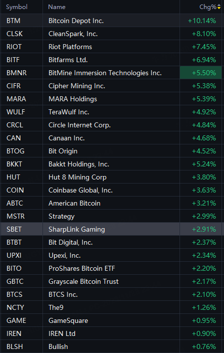CleanSpark rose 8%; Riot Platforms, Bitfarms rose 7%; BMNR up 6%; MARA, Canaan up 5%; Coinbase up 4%; Strategy, SBET up 3%.