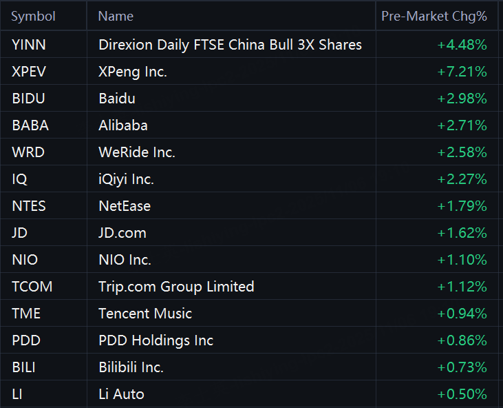 Chinese ADRs rallied in premarket trading. YINN rose 5%; XPeng rose 7%; Baidu, Alibaba, and WeRide rose 3%; iQiyi, NetEase, and JD.com rose 2%; NIO and Trip.com rose 1%; Tencent Music and PDD Holdings rose 0.9%.