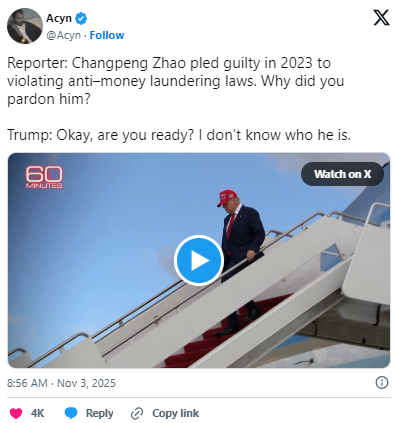 The comments came shortly after Trump’s trip to Asia, where he met Chinese President Xi Jinping and signaled easing tensions. The October pardon lifted restrictions that had prevented Zhao from operating financial businesses.