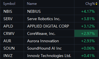 Nebius, Serve Robotics rose 4%; CoreWeave, Aurora Innovation, APLD up 3%.