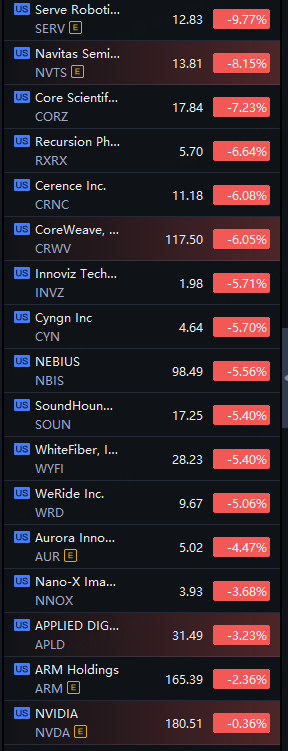 Nvidia Concept Stocks Kept Dropping. Serve Robotics down 10%; Navitas Down 8%; Core Scientific down 7%; Recursion, CoreWeave and Cerence Down 6%.