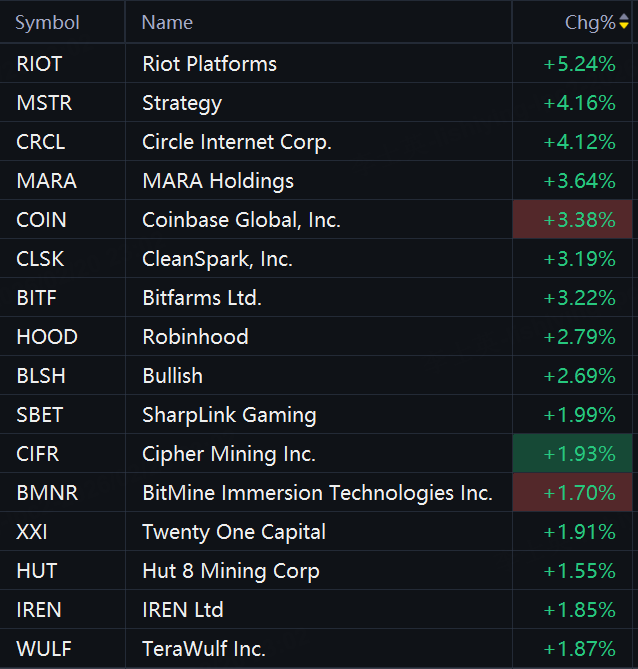 Crypto stocks gained in morning trading. Riot Platforms rose 5%; Strategy, Circle, and MARA Holdings rose 4%; Coinbase, Bitfarms, CleanSpark, Robinhood, and Bullish rose 3%; SharpLink Gaming, Cipher Mining, IREN, and BitMine rose 2%.