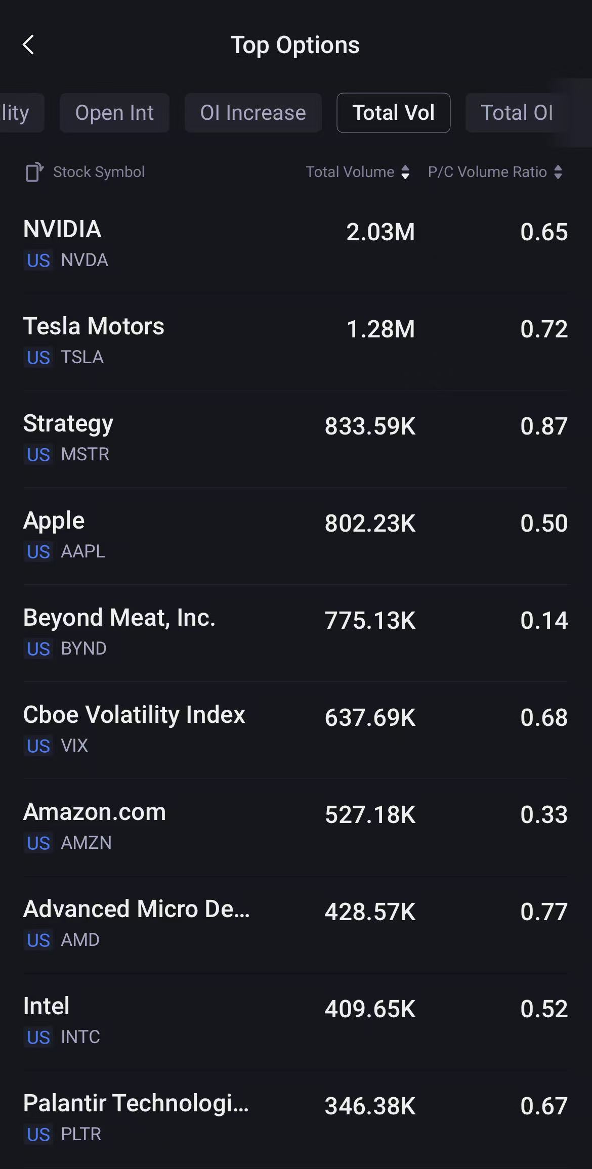 Top 10: NVIDIA, Tesla Motors, Strategy, Apple, Beyond Meat, Inc., Cboe Volatility Index, Amazon.com, Advanced Micro Devices, Intel, Palantir Technologies Inc.