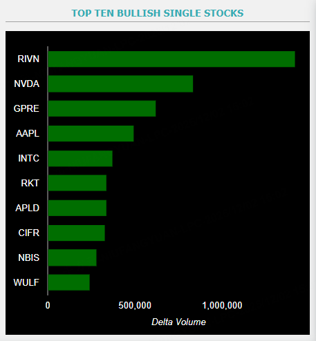 Top 10 bullish stocks: Rivian Automotive, Inc., NVIDIA, Green Plains, Apple, Intel, Rocket Companies, APPLIED DIGITAL CORP, Cipher Mining Inc., NEBIUS, TeraWulf Inc.