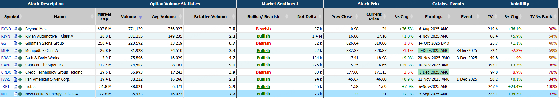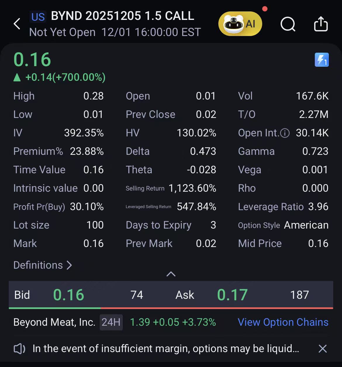 A total number of 771.13K options related to Beyond Meat, Inc. were traded on Monday, of which call options accounted for 88%. Particularly high volume was seen for the $1.5 strike call option expiring Dec. 5, with 167,214 contracts trading. For example, the $1.5 strike call options expiring December 5 rocketed over 700% on Monday. $BYND 20251205 1.5 CALL$