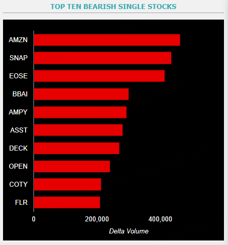 This report shows stocks with the highest volume of bullish and bearish activity by option delta volume, which converts option volume to an equivalent stock volume (bought or sold).