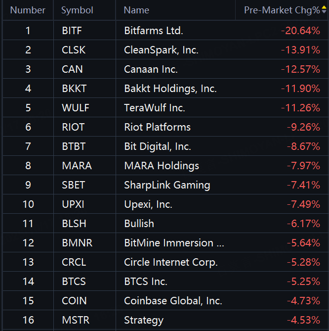 Crypto shares sank in premarket trading. Bitfarms down over 20%; CleanSpark down 14%; Canaan down 13%; Bakkt down 12%; TeraWulf down 11%; Riot Platforms down 9%; Bit Digital, MARA down about 8%.