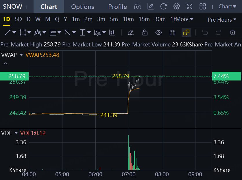 The pre-market rally was triggered by news of a strategic partnership between Snowflake and Palantir Technologies, a leader in data analytics and AI solutions. The two companies announced their collaboration to deliver enterprise-ready AI and analytics solutions, combining Snowflake's powerful data cloud platform with Palantir's advanced AI capabilities. This partnership is expected to enhance both companies' offerings and provide more comprehensive solutions to their enterprise clients.