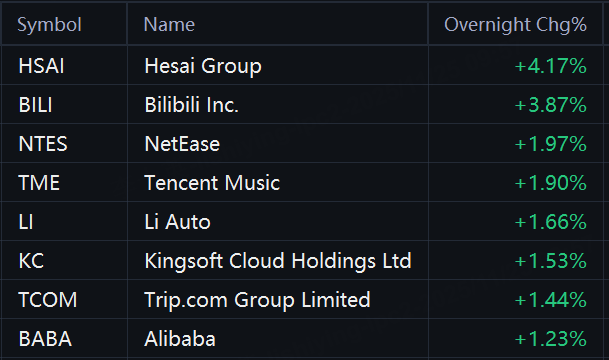 Some Chinese ADRs rose in overnight trading. Hesai Group and Bilibili rose 4%; NetEase, Tencent Music, Li Auto, and Kingsoft Cloud rose 2%; Trip.com and Alibaba rose 1%.