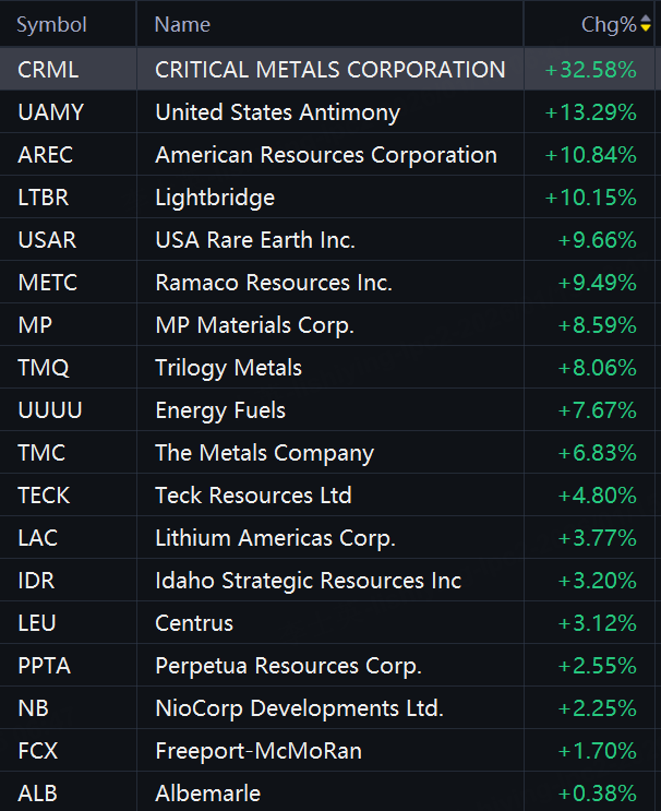 Rare earth stocks soared on Wednesday. Critical Metals rose 33%; United States Antimony rose 13%; American Resources rose 11%; Lightbridge, USA Rare Earth, and Ramaco Resources rose 10%; MP Materials rose 9%; Trilogy Metals and Energy Fuels rose 8%; The Metals Company rose 7%.