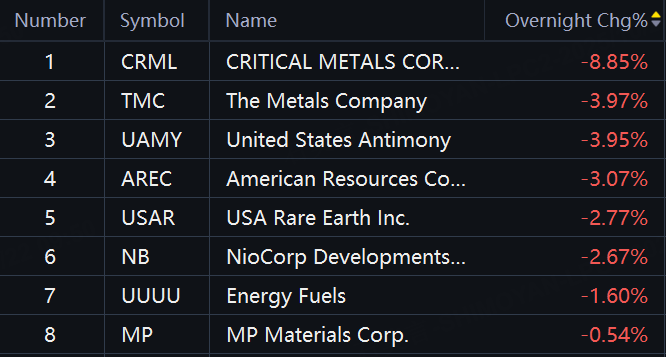 Rare earth stocks fell in overnight trading. Critical Metals down 9%; The Metals, UAMY down 4%; American Resources, USA Earth Earth down about 3%.