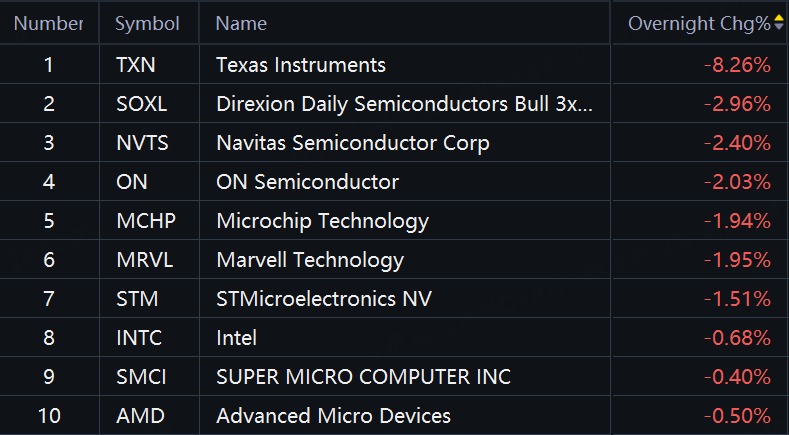 Chip stocks mostly fell in overnight trading. SOXL, Navitas, ON Semi, Microchip, Marvell down around 2%; STM down over 1%.