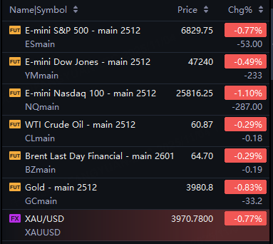 24H|Big Tech Stocks Drop; Nasdaq Futures down 1%; Palantir down 6%; Micron down 4%; Nvidia, Tesla, AMD, Amazon, Oracle, TSMC down 2%