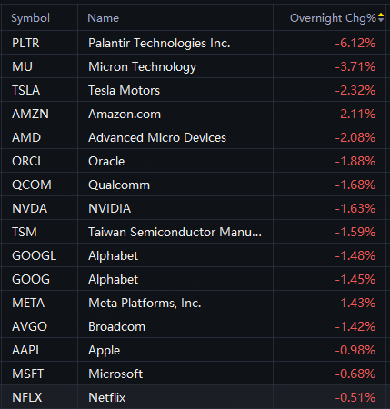 Big tech stocks fell in overnight trading. Palantir fell 6%; Micron fell 4%; Nvidia, Tesla, AMD, Amazon, Oracle, TSMC fell 2%; Meta, Apple fell 1%.