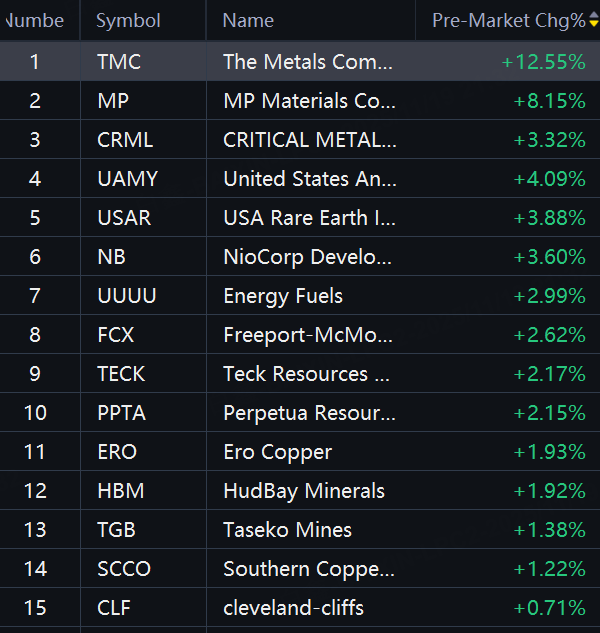 Rare Earth Stocks Jump. The Metals up 13%; MP Materials up 8%; UAMY up 4%; Critical Metals, USAR, NB and Energy Fuels up 3%.