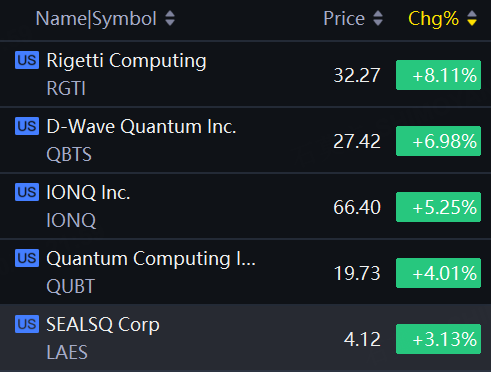 Quantum shares rallied. Rigetti up 8%; D-Wave Quantum up 7%; IONQ up 5%; Quantum Computing up 4%; SEALSQ up 3%.