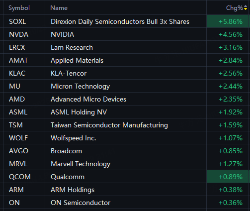 Semiconductor shares rose in Wednesday trading. SOXL up 6%; Nvidia up 5%; AMD, Micron, TSMC rose 2%; Broadcom rose 1%.
