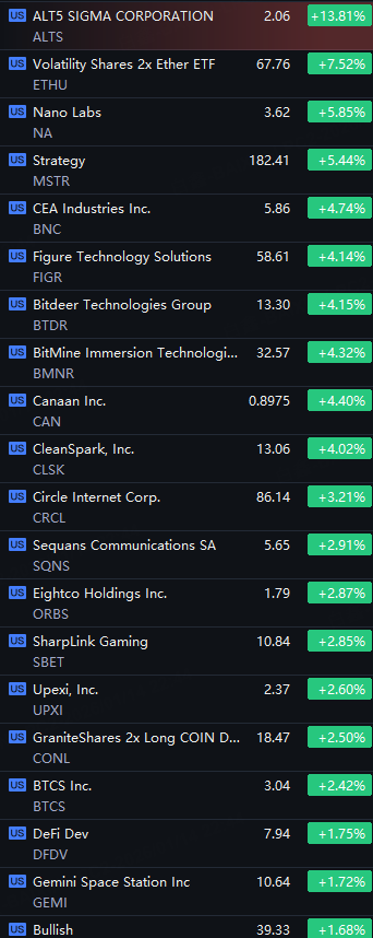 Crypto Stocks Rise as BTC Jumps to $96K; ALT5 up 14%; Nano Labs and Strategy up 5%; Figure and BMNR up 4%; Circle up 3%.