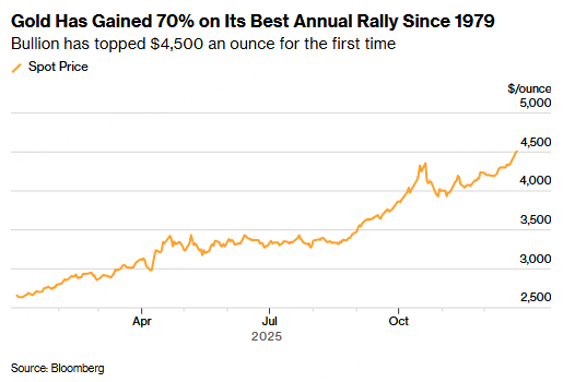 Underscoring this demand, gold bounced back quickly after a retreat from its previous peak of $4,381 an ounce in October, when the rally was seen as overheated. It is now positioned to carry these gains into next year. Goldman Sachs Group Inc. is among several banks to predict prices will keep rising in 2026, issuing a base-case scenario of $4,900 an ounce with risks to the upside.