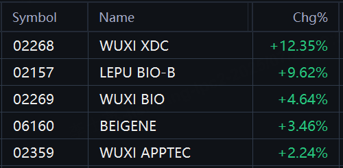 Hong Kong-listed innovative drug concept stocks rallied again, led by WuXi XDC, which soared 12% after issuing a positive profit alert. Lepu Biopharma jumped over 10%, WuXi Biologics climbed 5%, BeiGene advanced over 3%, and WuXi AppTec gained 2%.