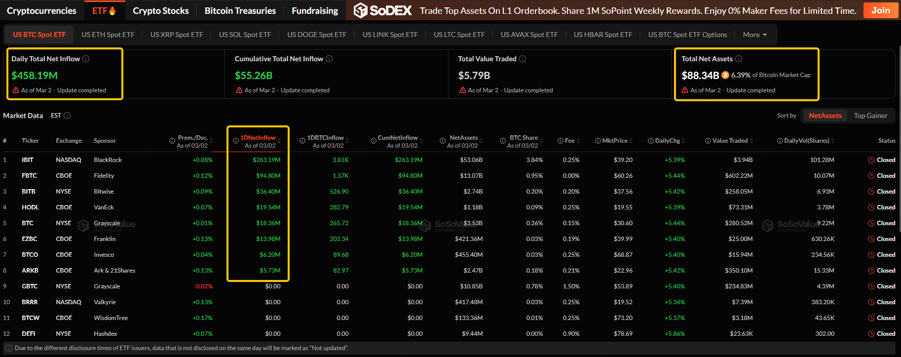 The overall net inflow of the US Bitcoin spot ETF on Monday was $458.19 million. The total net asset value of Bitcoin spot ETFs is $88.34 billion, and the ETF net asset ratio (market value compared to the total Bitcoin market value) is 6.39%.