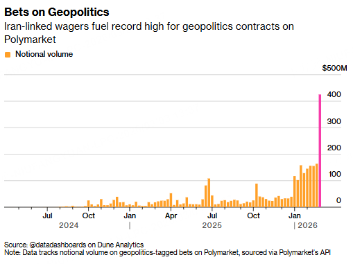 Bettors placed $425.4 million in wagers on geopolitics questions on Polymarket in the week ending March 1, up from $163.9 million the week before, according to user-compiled data on Dune Analytics. Across the site, total wagering reached a record $2.4 billion, up from $1.8 billion a week earlier.