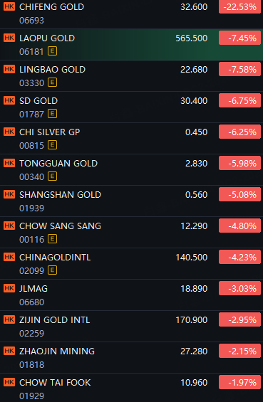 HK Gold Stocks Fell. Chifeng Gold down 23%; Laopu Gold and Lingbao Gold Down 7%; SD Gold, Chi Silver and Tongguan Gold Down 6%; Shangshan Gold Down 5%.
