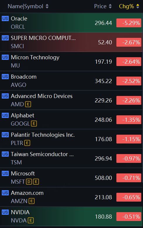 Big Techs Fall. Oracle Down over 5%; Super Micro, Micron, Broadcom Down over 2%; Alphabet, Palantir Down over 1%