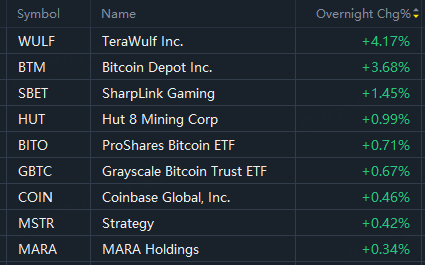 Crypto shares gained in overnight trading as Bitcoin rose nearly $106K. TeraWulf Inc., Bitcoin Depot Inc. up 4%; SharpLink Gaming, Hut 8 Mining Corp up 1%.