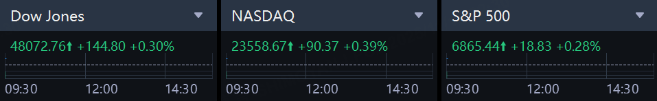The S&P 500 gained 0.28%, while the Nasdaq Composite climbed 0.39%. The Dow Jones Industrial Average hit a fresh record, rising 144.8 points, or 0.3%.