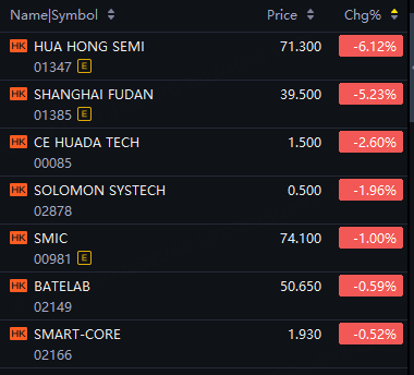 Hong Kong’s semiconductor stocks fell on Thursday. Hua Hong Semi fell 6%; Shanghai Fudan fell 5%; CE Huada Tech fell 3%; Solomon Systech fell 2%; SMIC fell 1%.