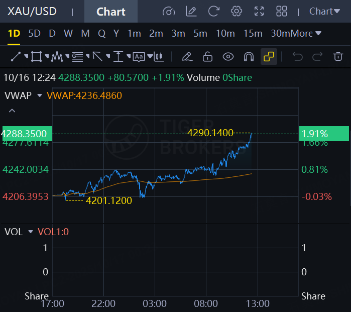 Spot gold rose 1.9% and hit another record high of $4,290 per ounce.
