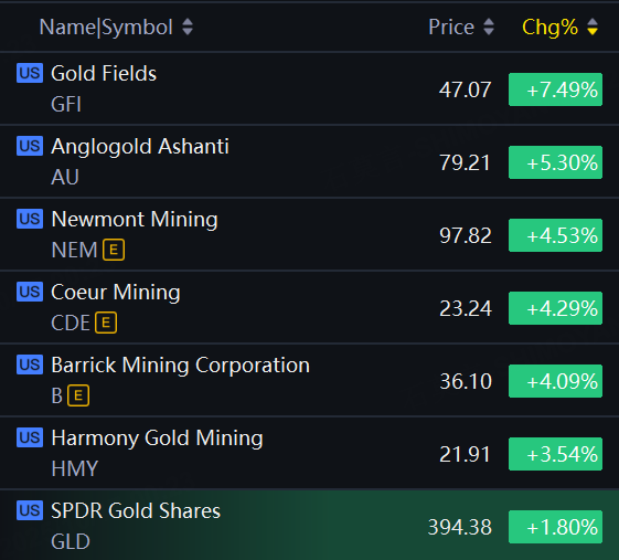 Gold stocks rose on Thursday. SPDR Gold Shares ETF up 2%; Gold Fields up over 7%; Anglogold up over 5%; Newmont Mining, Coeur, Barrick up over 4%.