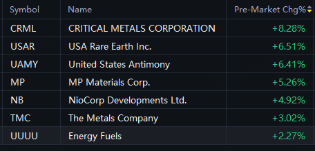 Critical Metals up 8%; USA Rare Earth up 7%; United States Antimony up 6%; MP Materials, NioCorp up 5%; The Metals Company up 3%.