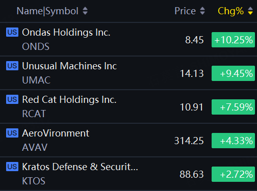 Drone makers jumped on Monday. Ondas Holdings up 10%; Unusual Machines up over 9%; Red Cat up over 7%; AeroVironment up over 4%; Kratos Defense up nearly 3%.